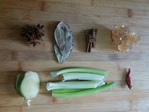 准备辅料,八角、香叶、桂皮、冰糖、大葱、老姜和干红辣椒