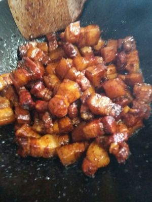 放入焯好水的五花肉,迅速煸炒,没有放酱油呦,靠糖色已经很漂亮了