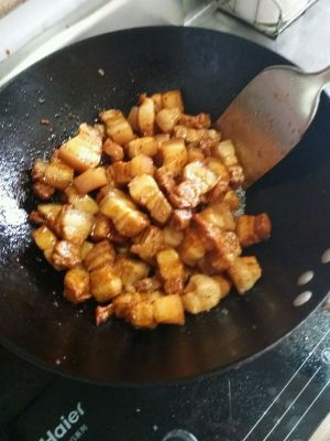 炒糖色(颜色不要太深),炒好后放入五花肉裹匀颜色,放热水没过五花肉,依次放入料酒,盐,冰糖