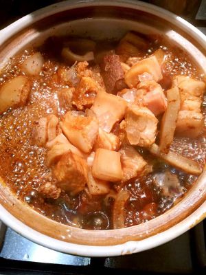 如果不喜欢猪肉有一股味道就过一下水,我这边的猪肉没国内那股肉腥味所以我就没过水了,放入老抽、生抽、桂皮、八角、冰糖,添加没过肉2/3的水。