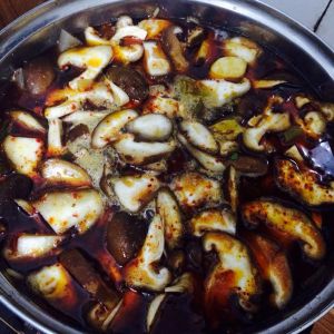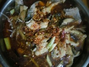 第四步:腌制的鱼好了用水冲洗干净,放入嫩肉粉伴匀待用。炒菜的锅倒入菜籽油至油8分辣时,丢入花椒、蒜与姜微炸。关火放入鱼佐料,干辣椒继续开小火微炒。待香味扑鼻加入适当水然后换上刚才的平底锅将油汤全数倒进去。开大火煮,并把酸菜放入,接着平铺香菇。不盖盖子直接煮