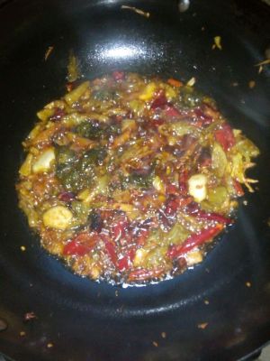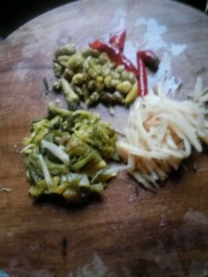 锅内下稍微多点油,烧热后下干辣椒,花埱粒,大蒜,泡姜,泡椒,泡青菜。多炒几下使其更加入味,加清水或高汤煮至沸腾