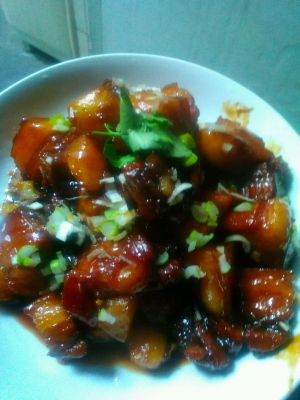 放入少许水淀粉(因为糖和油够量,汤汁本身就会比较浓稠,水淀粉不需要太多),大火收汁即可。因为老公喜欢花生,所以我放了点炸花生,不放也可以
