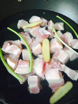 焯水:整块五花肉冷水下锅,放少许葱姜,大火烧开,煮十分钟左右,然后捞出将肉切块(整块肉下锅焯水可以保留更多香味)