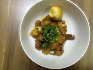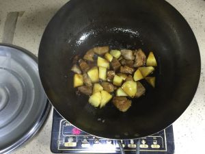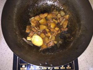 放入老抽一勺,生抽一勺,放入土豆,炒变色