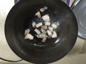 肉炒出油后放入豆腐香菇加水煮。放盐、鸡精,中火煮大约10分钟后加入少量水定粉。在煮7分钟后改大火收汁。