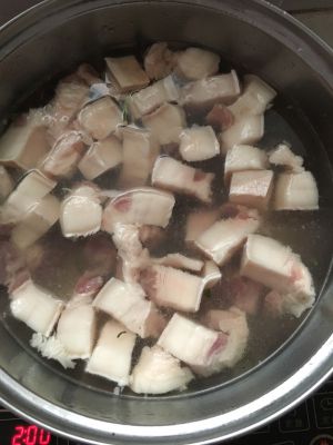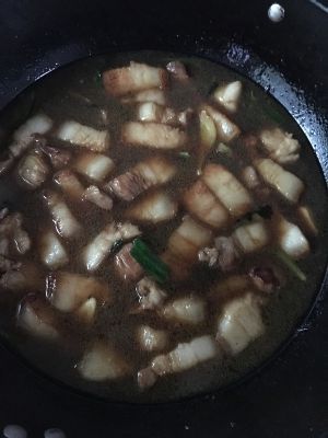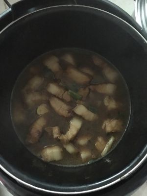 3.放开水没过肉,加南乳汁,酱油,老抽。开锅后调到小锅炖1.5小时。