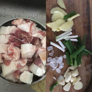 准备材料,五花肉,葱切段,姜切片,蒜切片,冰糖