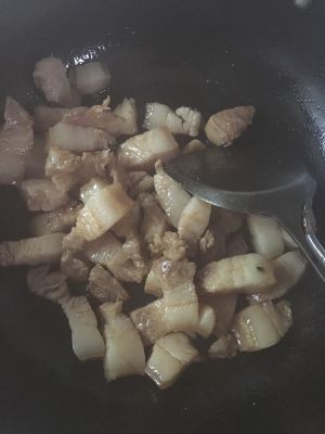 2.锅中放一点油,不要多,肉会出油。放白糖炒糖色,放进肉翻炒,变色后放去葱姜等调料,继续翻炒出香味。