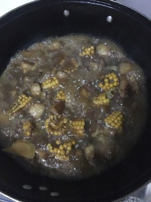 煮15分钟之后再倒入炒锅里面,大火收汁,这时候可以加点调料,盐根据自己口味加,鸡精,喜欢甜的可以再加点冰糖,我是里面放了玉米,也可不放,如果想放玉米就在五花肉倒入电饭煲里面的时候放,也可放土豆,竹笋