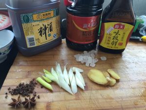 此时放入事先备好的姜蒜,干红椒,八角(此时放可以避免过分翻炒导致的糊味,又可以让其味充分释放),然后依次放入黄酒,酱油,黄豆酱,醋,适量盐~