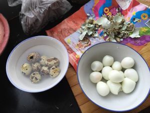 鹌鹑蛋煮熟剥去外壳依旧盛盘备用