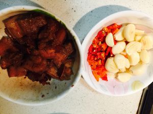 将红烧肉放入大蒜子辣椒中一起翻炒拌匀,岀锅