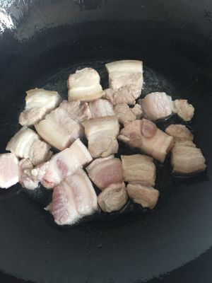 将事先备好的五花肉放入七分热油的锅里进行翻炒~