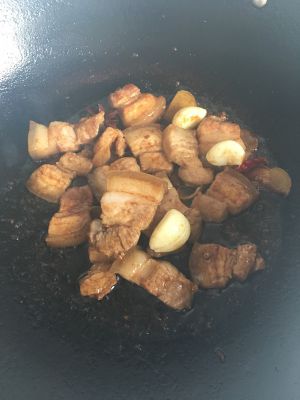 锅内倒油,小火倒入五花肉,翻炒至肉皮微微发焦后加入葱姜蒜八角翻炒 然后烹料酒生抽老抽后继续翻炒让肉块着色,当你能闻到浓厚的酱香味时,加入没过食材的开水大火烧开后,加入葱结和冰糖转小火炖一个小时。