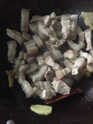 放入焯好的五花肉,翻炒到五花肉变得金黄