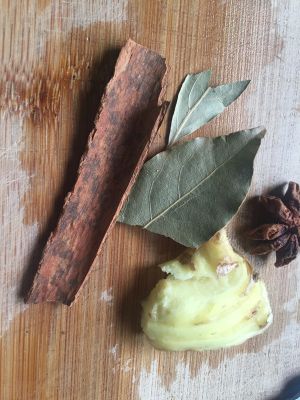糖炒好后,放入葱段、八角两个、生姜2片、香叶2片、草果1个,小茴香1小把、干辣椒1小把,煸炒出香味