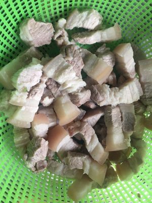 把五花肉切成小块。锅烧热,不要放油,把五花肉放在锅中,中火煎到两面淡黄色盛出。(250克肉不要一次煎,基本分三、四次煎。)煎出不少肥油呢,肥油弃之不用。