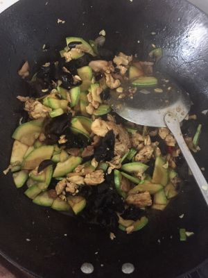 加入土豆丁、洋葱丁、香菇云耳丁,料汁、姜片蒜片一起中小火焖