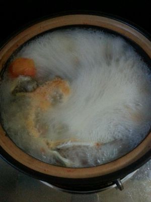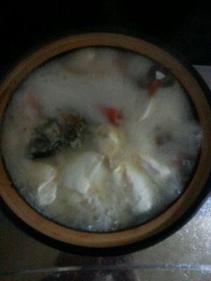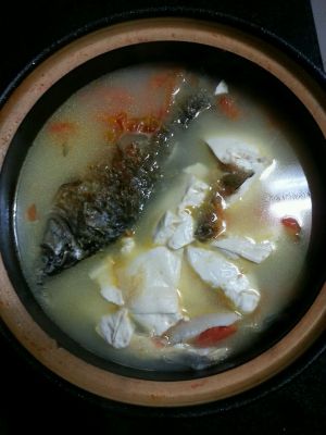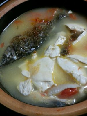 将两面煎黄的鲫鱼、汤料、豆腐和姜片一起放入砂锅或陶锅中,倒入6~8小碗水,用大火煮开,然后调小火煲1小时左右,起锅前放适量盐调味即可。