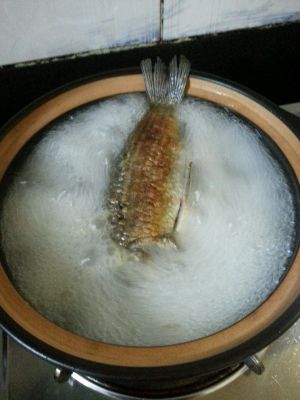 另起沙锅煲好开水!把煎好的鱼放进去!