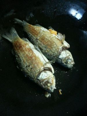 煎至两面金黄后倒入适量清水、料酒、姜片以及葱段