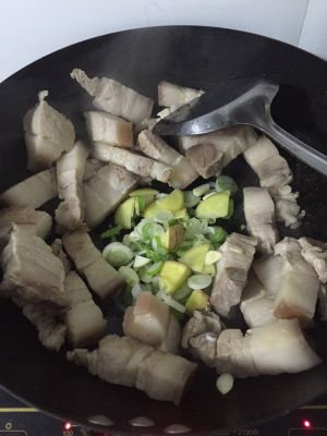 锅里放一点点油,把凉了的五花肉放进锅里,开始小火煸炒,开始放一点油是为了防止猪肉糊锅。