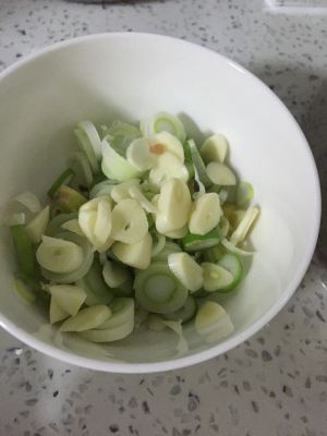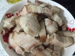 1,把焯好的五花肉在洗干净(猪皮记得用刀刮干净,要不会有味道) 2,五花肉切片备用 3,姜切片备用,蒜拍两瓣