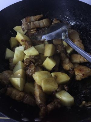 把之前准备好的红烧料倒进锅中,开始炒,炒到闻到香味,把糖色倒进去