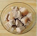 五花肉切块入沸水锅中焯烫2分钟,捞起冲洗干净;