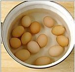 鸡蛋放入锅里加冷水烧开,转中火开盖煮5分钟入冷水过凉;