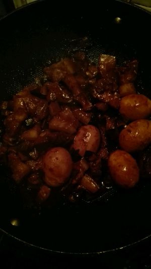 加入生抽,老抽,料酒,炒香上色。加水没过食材大概2厘米吧。大火烧开转中火炖一个半小时,自己掌握时间。