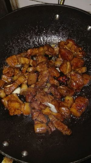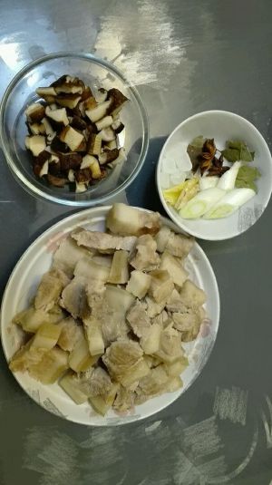 油烧热先下大料桂皮爆香,下五花肉煸炒几下,放香叶,葱,姜片,冰糖,香菇一起煸炒至肉表面微微焦黄。