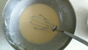 鸡蛋和面粉加少许水,打成较为稠些的面糊。