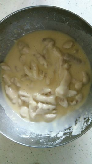 将拌过淀粉的肉条倒入鸡蛋面糊,充分搅拌均匀。