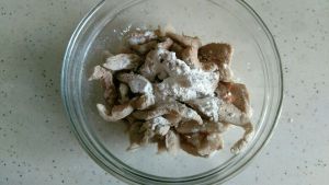 腌制入味后抓一层干淀粉,然后再抓一层湿淀粉,抓匀后再来一把干淀粉,让肉条一根根分开。