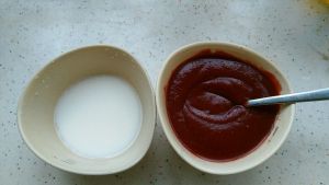 将番茄酱,白醋,盐,糖及少许水淀粉调成糖醋汁,比例不同味道也不同,喜甜可多放糖,喜酸可多放醋。如用番茄沙司,可减少盐糖的用量。(淀粉要少加或者不加也行)