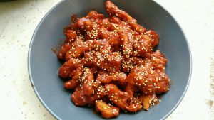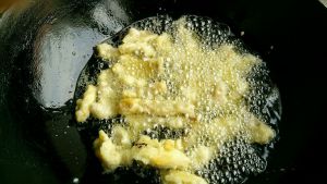 锅内将油烧至7成热后,将沾有面糊的肉条逐条下锅,炸熟后捞出;再将油温烧高,将所有炸熟的肉条倒入锅内,复炸至金黄色后捞出控油后备用。