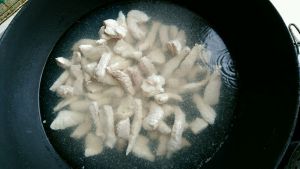 锅中放入底油,多一些,大火,油温8成热时,下入肉条,炸制金黄捞出