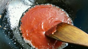 炸肉条的油倒出后锅内剩少许,倒入糖醋汁加热到粘稠状。