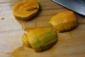 取250g芒果肉用料理机打成泥状,其余切小丁备用。