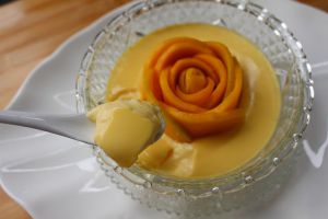 把做好的芒果花放入晾凉的“牛奶布丁“中间。