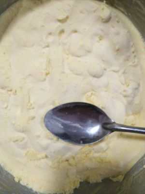 蛋黄牛奶糊好了,放一旁备用。(我的蛋黄糊收的不好,奶锅离火太近,有些焦鸡蛋皮。我用筷子挑出来了。)
