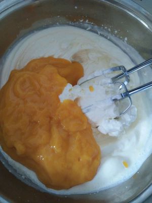 拌蛋黄糊、打发至7分的淡奶油糊、芒果糊。