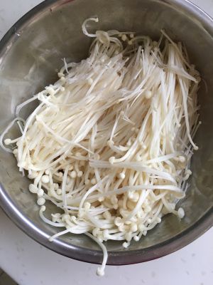 金针菇去根、撕开,水烧开放入洗好的金针菇,待水再次滚开捞出,挤干水待用