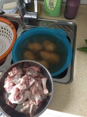 坐锅开水煮沸,鸡肉下水抄一下,捞出来。忘记拍照了(≧≦)。然后切菜,注意土豆要切大块点,不然炖熟就更小了。