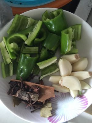 配料,桂皮、八角、丁香、香叶,青辣椒、大蒜,我的比较简单,家里有什么就放什么了,对啦、还有个配料很重要!啤酒!冰糖!