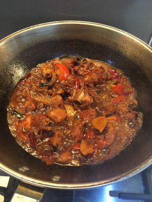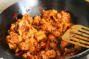 大约炒至鸡肉略干,要不断翻炒,不要糊锅哦,会有和浓郁的香味出来,肉也6成熟了