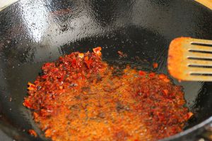 油热之后放两大勺郫县豆瓣酱,用铲子迅速划开