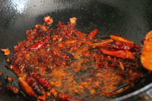 锅里留下一大勺的热油,放入姜葱蒜,干辣椒爆香。